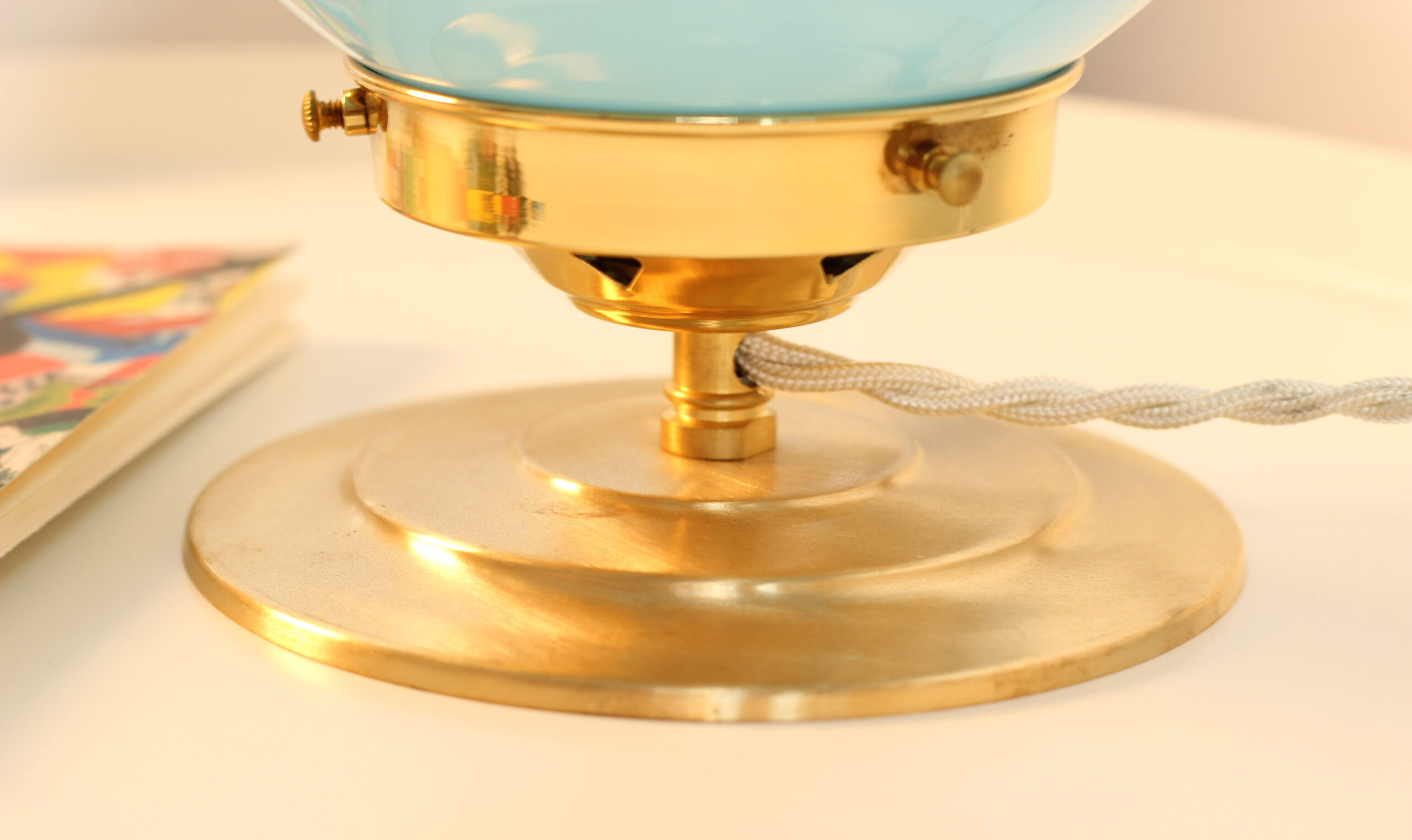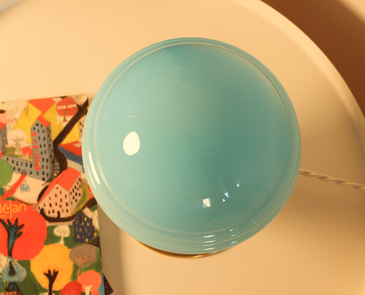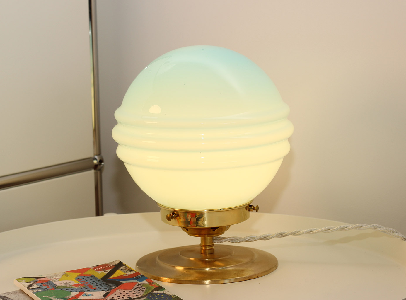 Candeeiro de mesa “Oceano”: Globo de vidro opalino em base de latão escovado.