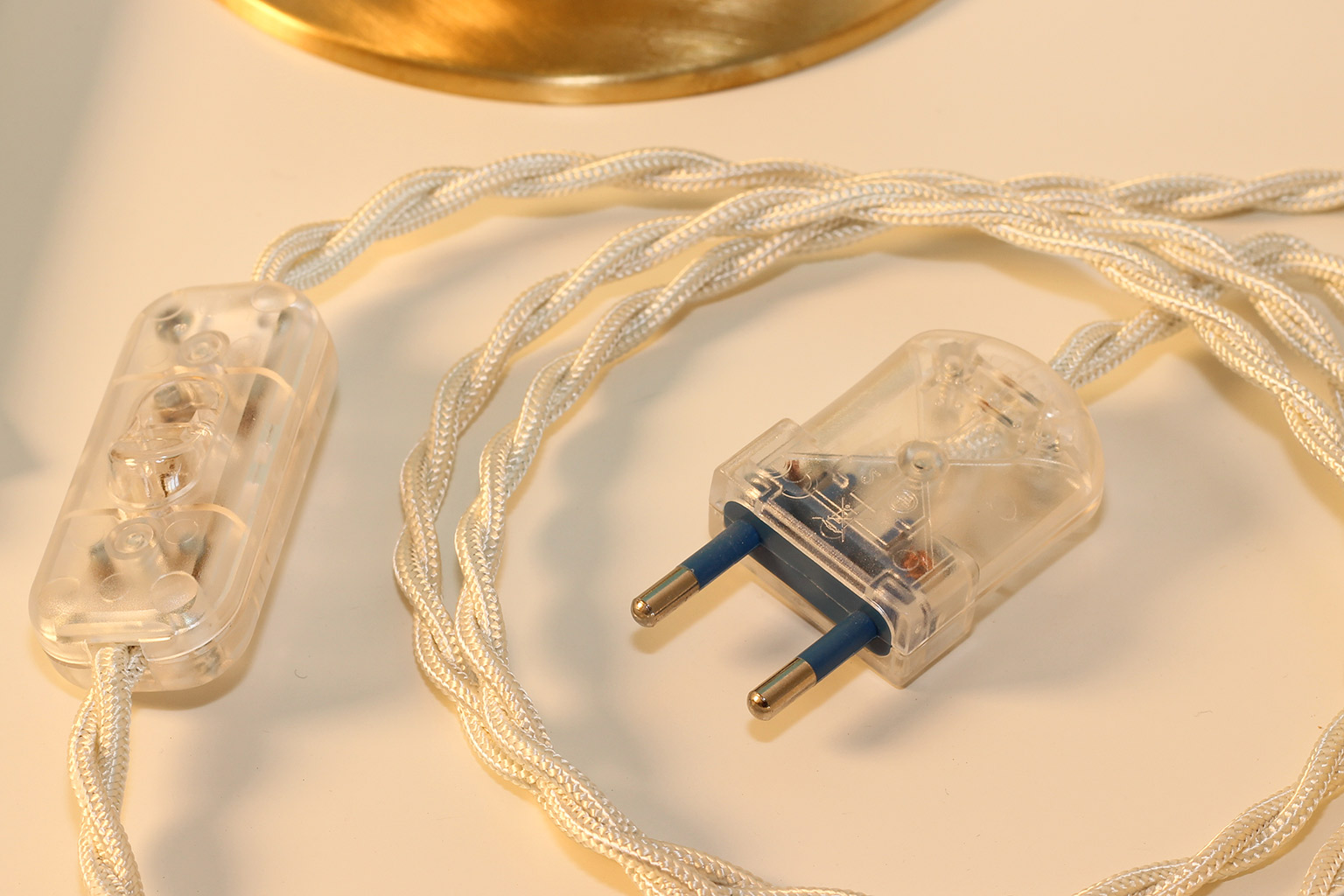 Cabo: Cabo têxtil branco, com 2m de comprimento. Poderá personalizar o seu candeeiro e optar por 9 tipos de cabos elétricos para personalizar o seu candeeiro.