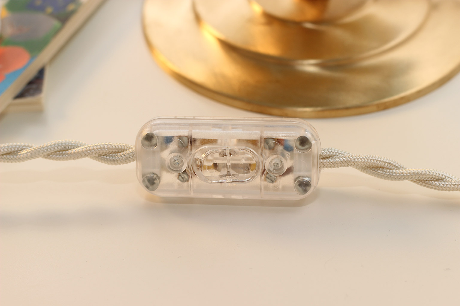 Interruptor: Localizado a 50 cm da base, disponível em branco ou transparente. O candeeiro é equipado com almofadas antiderrapantes para proteger o seu mobiliário.