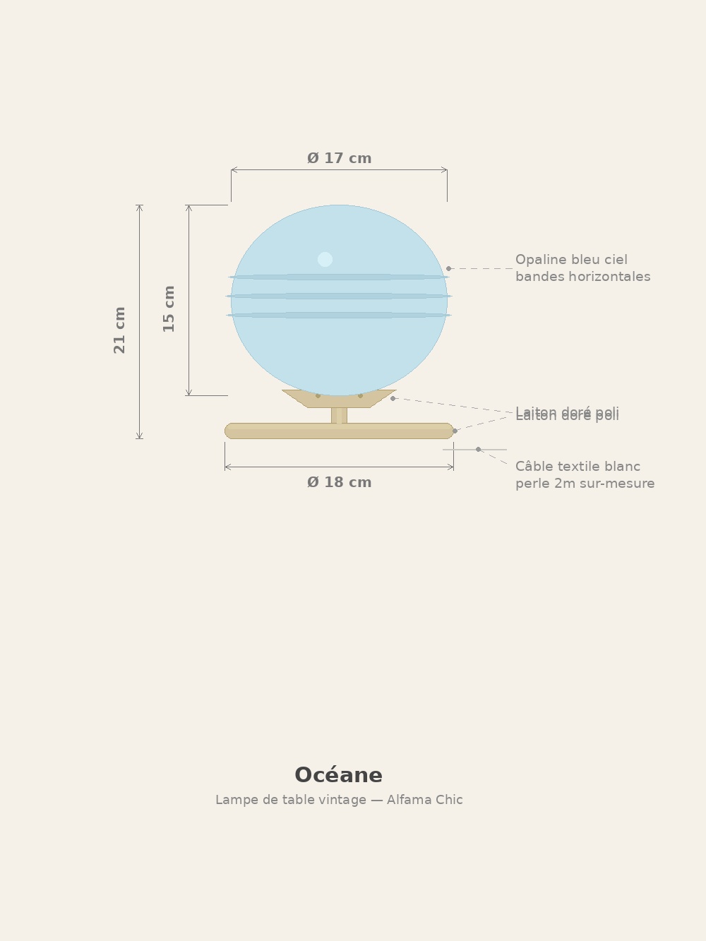 Descrição: O candeeiro de mesa “Oceano” é uma fusão entre a modernidade e a elegância do passado. O seu globo de vidro opalino, tratado para difundir uma luz suave e homogénea , assenta delicadamente sobre uma base em latão. Esta combinação de materiais oferece uma luminosidade discreta e ao mesmo tempo radiante.